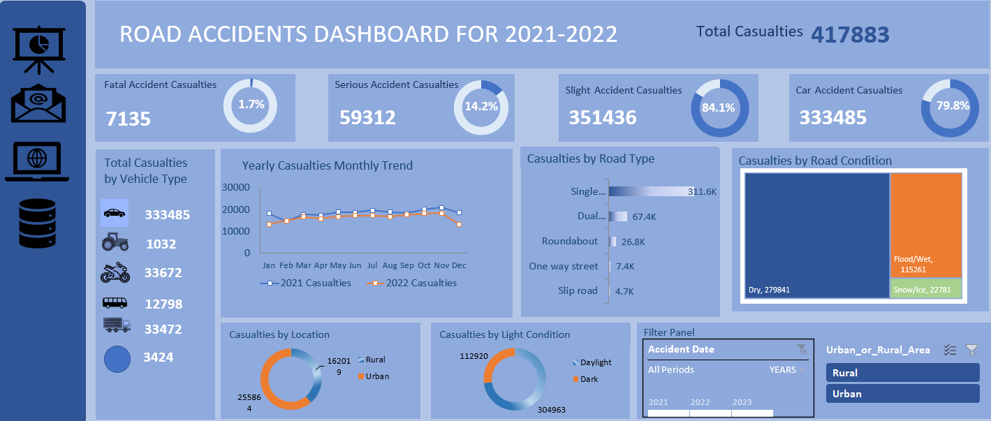 In this project I used Excel visualizations to analyze casualties caused by road accidents in year 2021-2022. At the end I created an interactive dashboard to present my findings. Read more about the project »